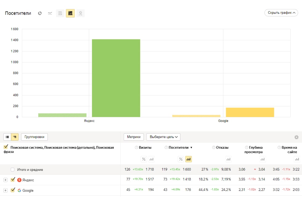 - Переходы из поисковых систем увеличились со 100 посетителей до 2400